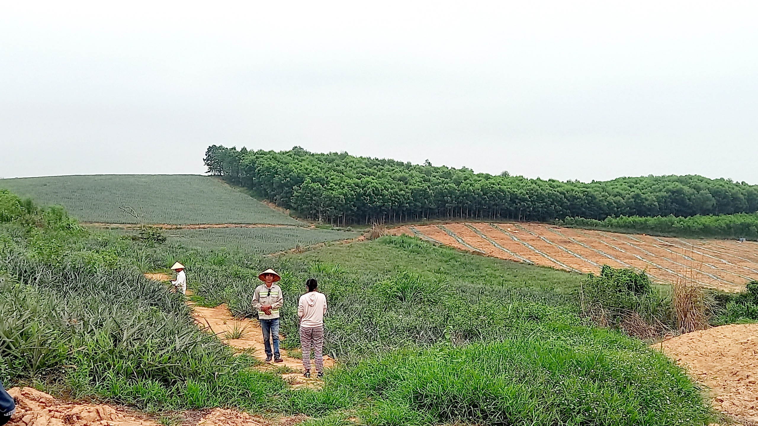 Chúng tôi được anh Hữu Hạnh dẫn đi tham quan đồi dứa, trải nghiệm việc thu hoạch dứa trên đồi. Vào mùa này đã gần hết đợt thu hoạch. Theo anh Hạnh chia sẻ, mỗi sáng sớm vào những đợt cao điểm, một gia đình vợ chồng có thể thu hoạch gần 2 tấn dứa, vác bằng vai từ trên đồi xuống dưới chân đồi mới có xe kéo về. Công việc nông trại rất vất vả.