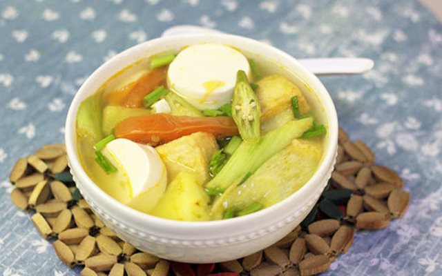 Bước 4: Đun từ 10 đến 12 phút thì cho tiếp đậu bắp vào đun cùng, đun khoảng thêm 5 phút nữa.