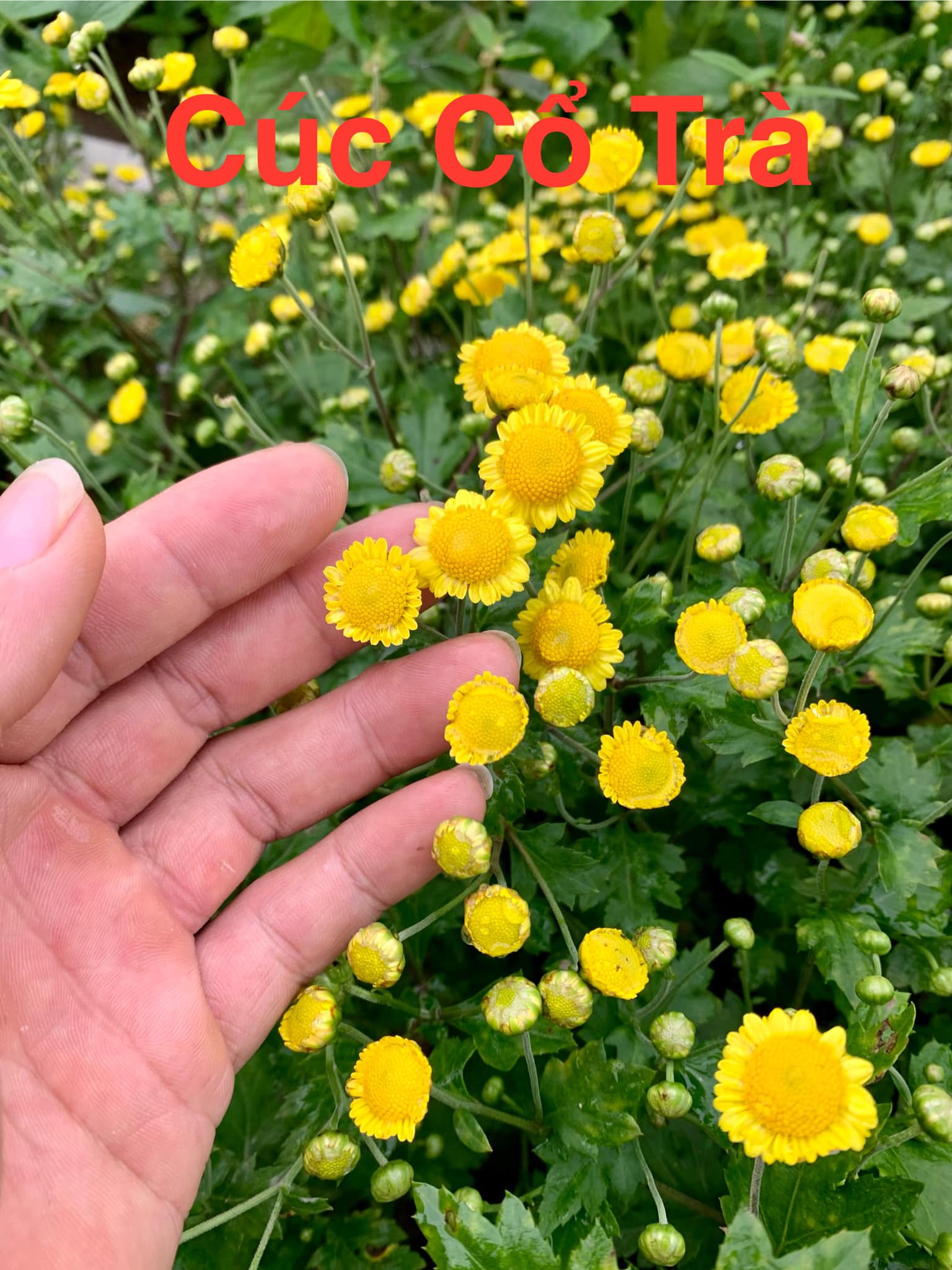 - Cúc Cổ Trà: Cánh lớn hơn nhiều so với nhụy, nhụy hoa có nhiều phấn hương(2 loại kia không có), nhuỵ xếp đều theo những đường xoắn ốc hướng tâm giống như hoa hướng dương. Kích thước hoa khoảng 2,1cm nhụy khoảng 1,1cm. Khi chớm nở sẽ bung cánh ra trước. Cánh hoa xếp dầy có hướng cong ngược xuống khi bung hết. Cánh hoa có màu vàng nhạt, nhụy đậm hơn màu hơi cam. Thân bụi, giòn, lá màu xanh sẫm.