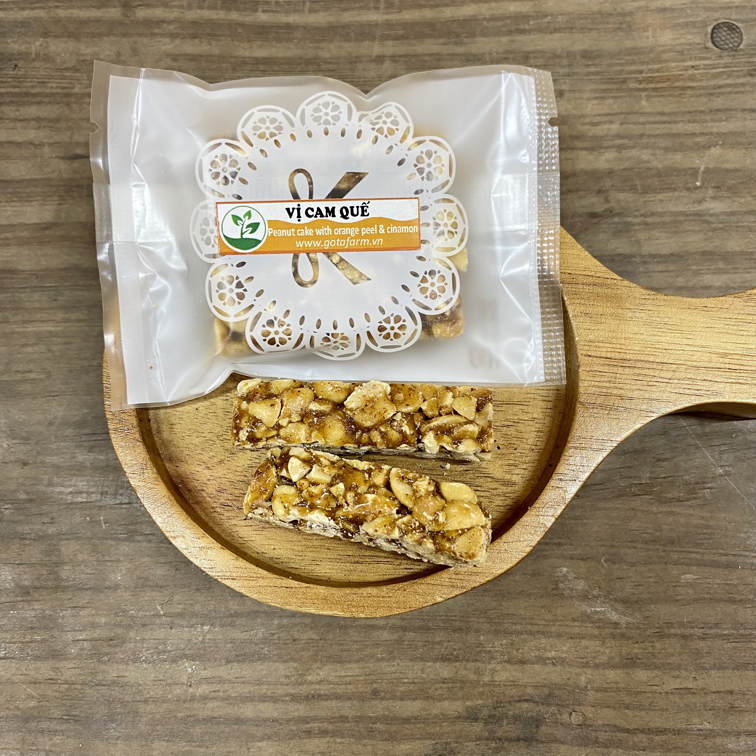 Kẹo Lạc Gotafarm - Vị Cam Quế sử dụng lạc đỏ canh tác an toàn tại Thái Thụy, Thái Bình và đường mật mía, đường mật hoa dừa để làm thành những thanh kẹo thơm ngon và tốt cho sức khỏe. Vị thơm - ngậy - bùi của lạc vừng kết hợp với vị thơm ngọt của Quế cân bằng với vị đắng nhẹ của vỏ cam tạo thành một hương vị mới tròn trịa và hấp dẫn.