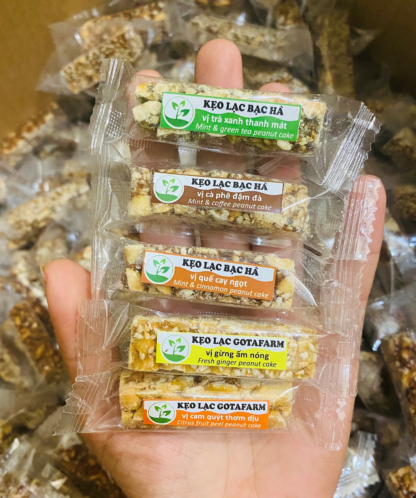 Kẹo lạc Bạc hà Mix vị có đủ các hương vị kẹo mà Gotafarm có vào thời điểm bạn đặt hàng. Thông thường nhất là hai hương vị cơ bản: Bạc hà Trà xanh và Bạc hà Cà phê.