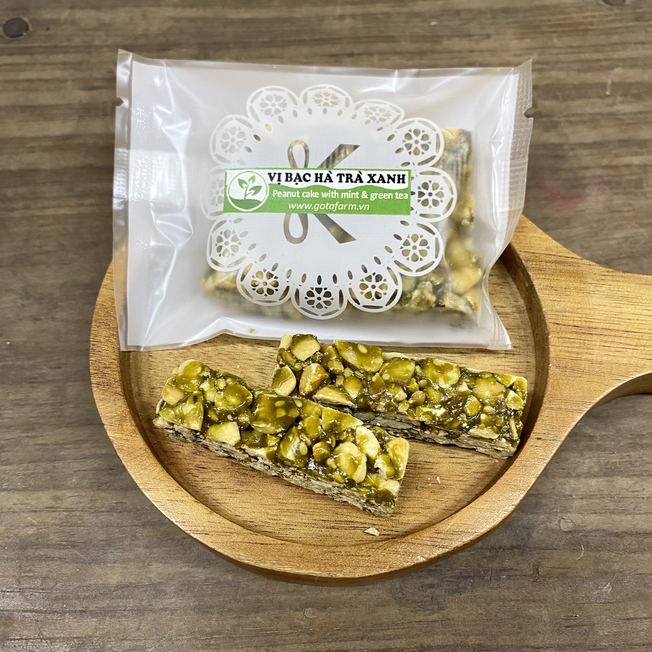 Kẹo Lạc Gotafarm - Vị Bạc Hà Trà Xanh sử dụng Lạc đỏ truyền thống được canh tác an toàn tại Thái Thụy, Thái Bình, đường mía quay li tâm Huỳnh Ngọc Châu để làm thành những thanh kẹo thơm ngon và tốt cho sức khỏe. Vị thơm - ngậy - bùi của lạc vừng kết hợp với vị cay the mát của Bạc hà tạo thành một hương vị mới độc đáo và ngon lạ miệng, kết hợp với nền chat nhẹ của Trà xanh làm cho hương vị tròn trịa và hấp dẫn.