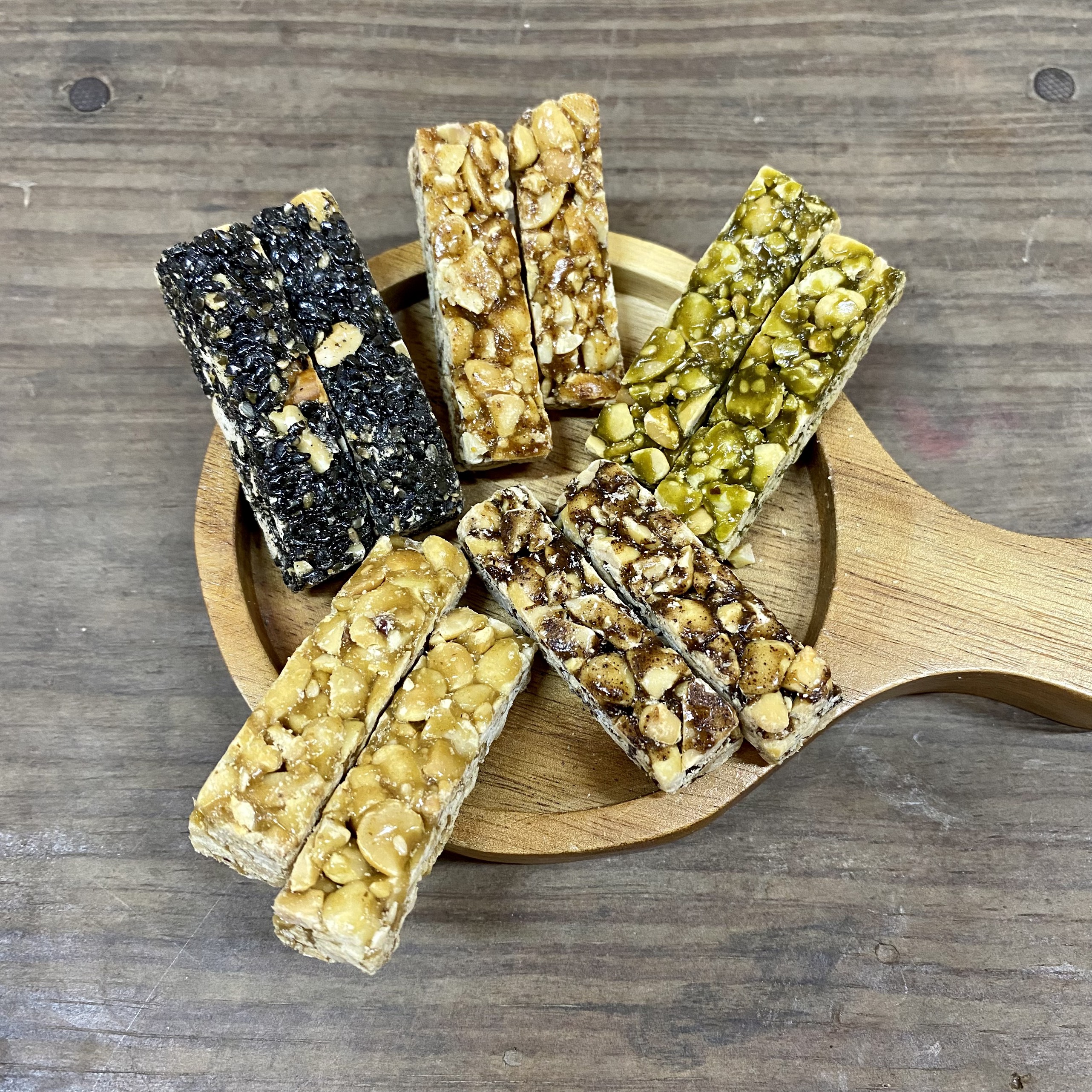 THÀNH PHẦN: Lạc đỏ truyền thống, vừng, mạch nha, đường mật mía, đường mật hoa dừa, bạc hà, bột trà xanh tự nhiên.