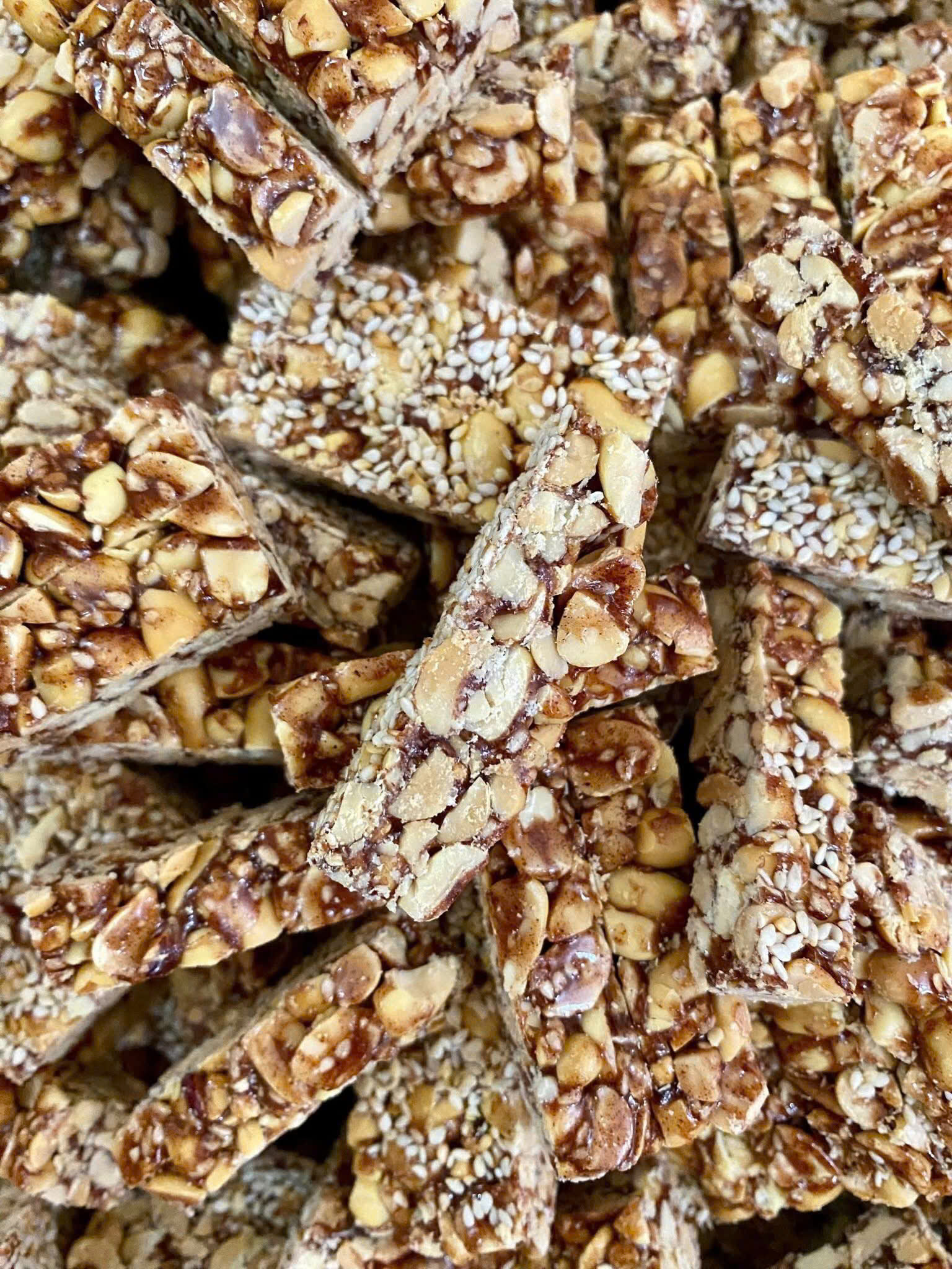THÀNH PHẦN: Lạc đỏ truyền thống, vừng, mạch nha, đường mật mía, đường mật hoa dừa, socola.